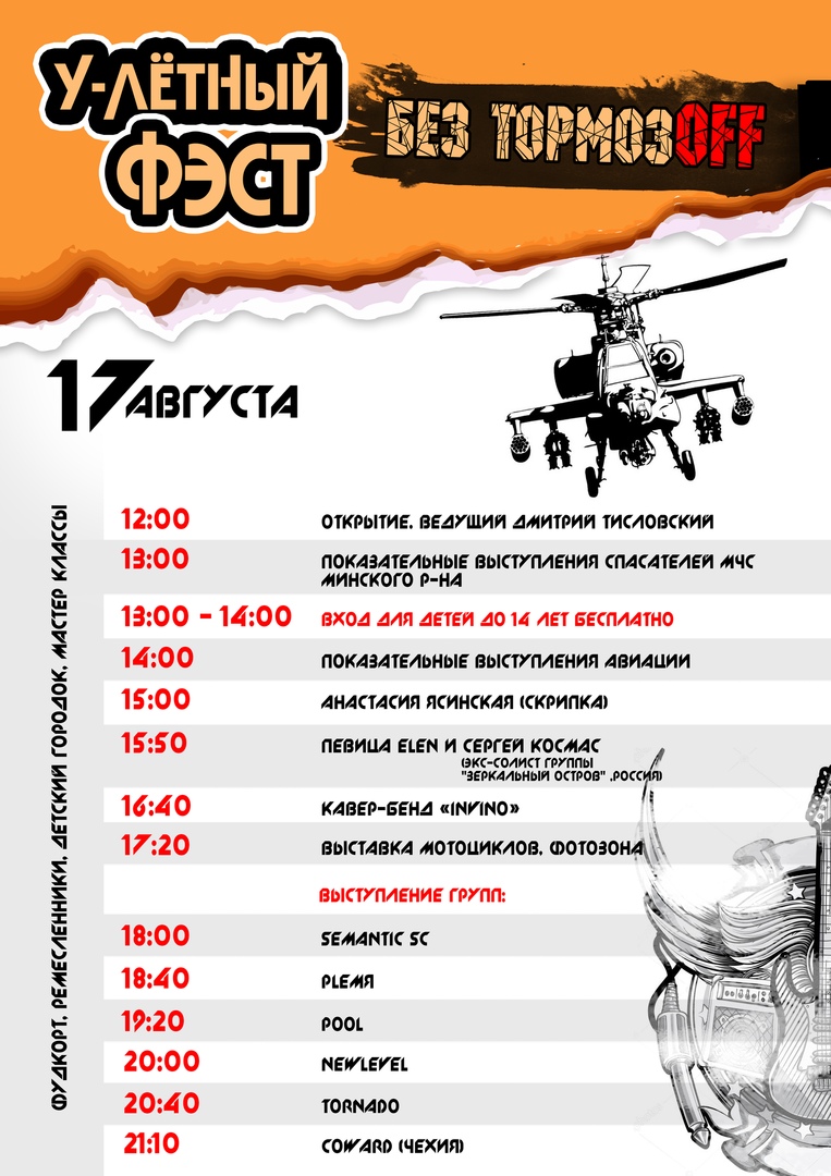 Вас ожидают яркие показательные выступления авиаторов, возможность покататься на технике, насыщенная концертная программа и веселые забавы.